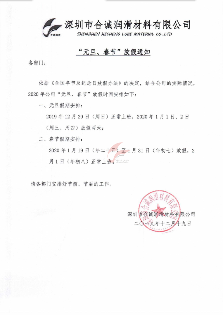 您好!首先祝贵公司生意兴隆,业绩蒸蒸日上!同时也非常感谢贵公司一直以来对我公司的信赖与支持!为更好的配合贵司,现将我司元旦、春节假期安排告知如下: