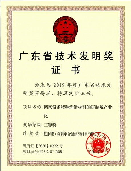 深圳市茄子视频黄色APP免费下载润滑材料有限公司“精密设备特种润滑材料的研制及产业化”项目荣获广东省人民政府批准颁发的2019年度广东省科学技术奖项——技术发明二等奖。